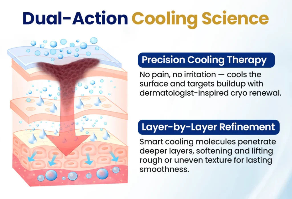 By rapidly lowering the temperature of the applied skin zone, it helps calm irritation, loosen hardened buildup, and activate the skin’s natural renewal cycle — all safely and comfortably at home.