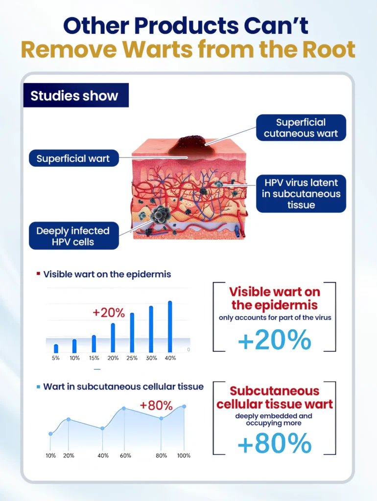 Traditional wart products can’t penetrate these deeper layers, leaving behind viral cells that cause frequent recurrence and incomplete results.